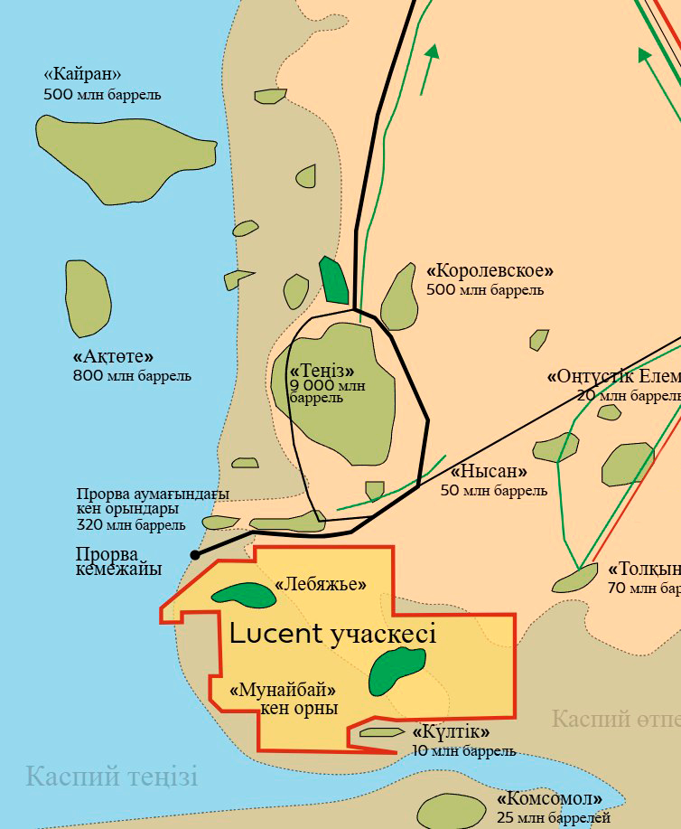 «Lucent Petroleum» компаниясы Атырау облысындағы «Лебяжье» және Маңғыстау облысындағы «Мұнайбай-Бақыт» кен орындарын игеруде. Кен орындарының екеуі де Каспий теңізінің өтпелі аймағының жағалық жағында, алып Теңіз кен орнынан оңтүстікке қарай шамамен 50 км жерде орналасқан, және екеуі де өндіруге дайындықтың соңғы сатысында.